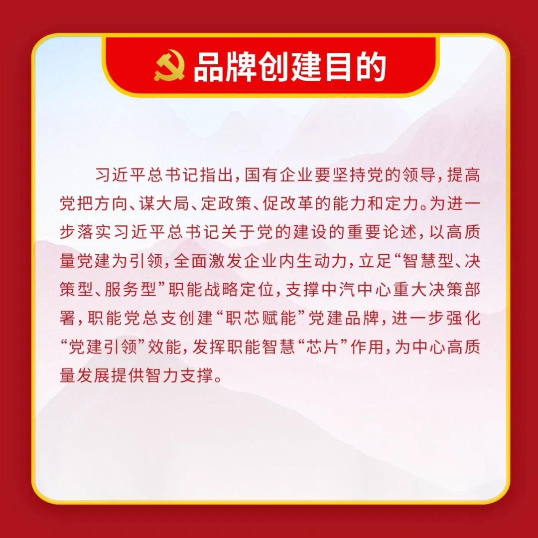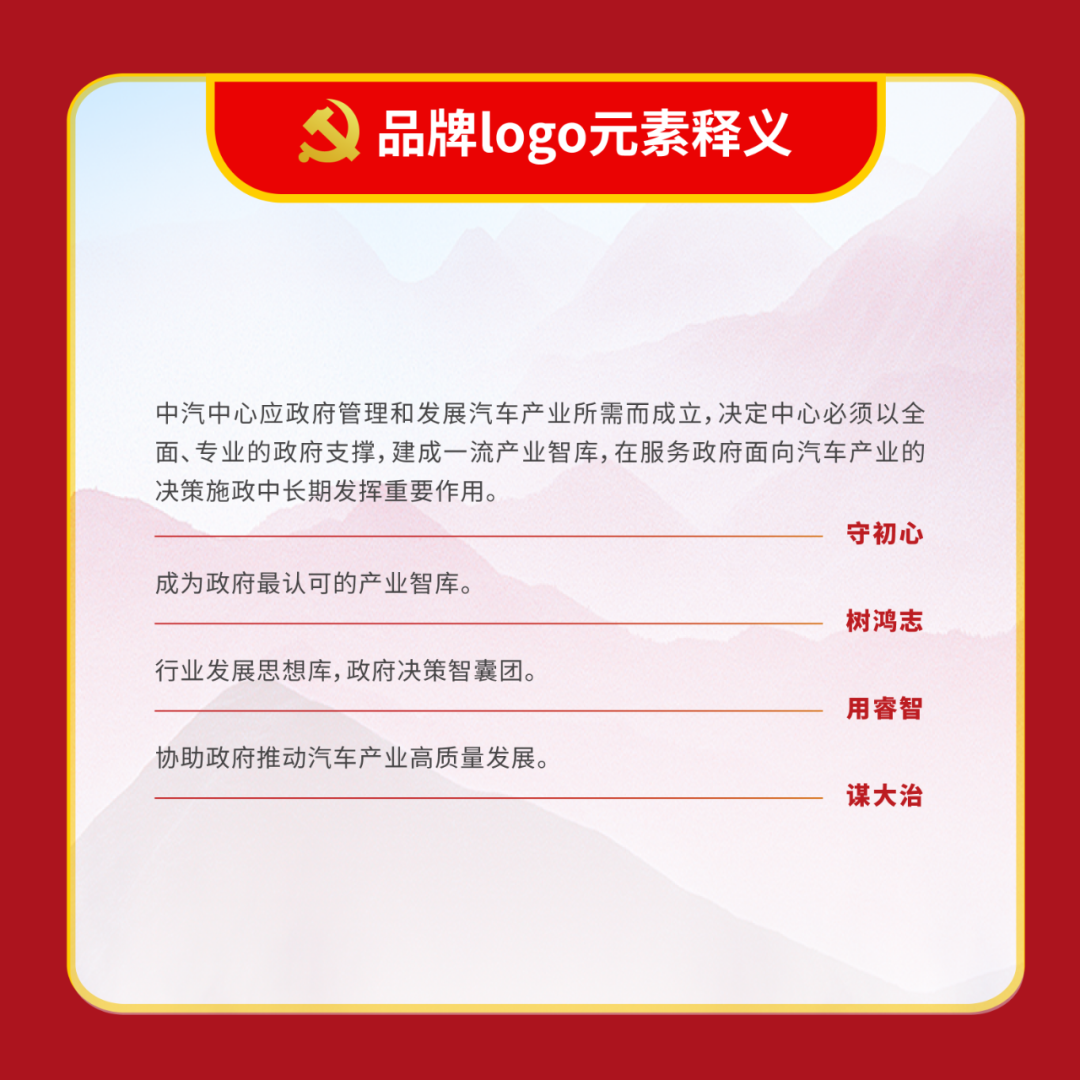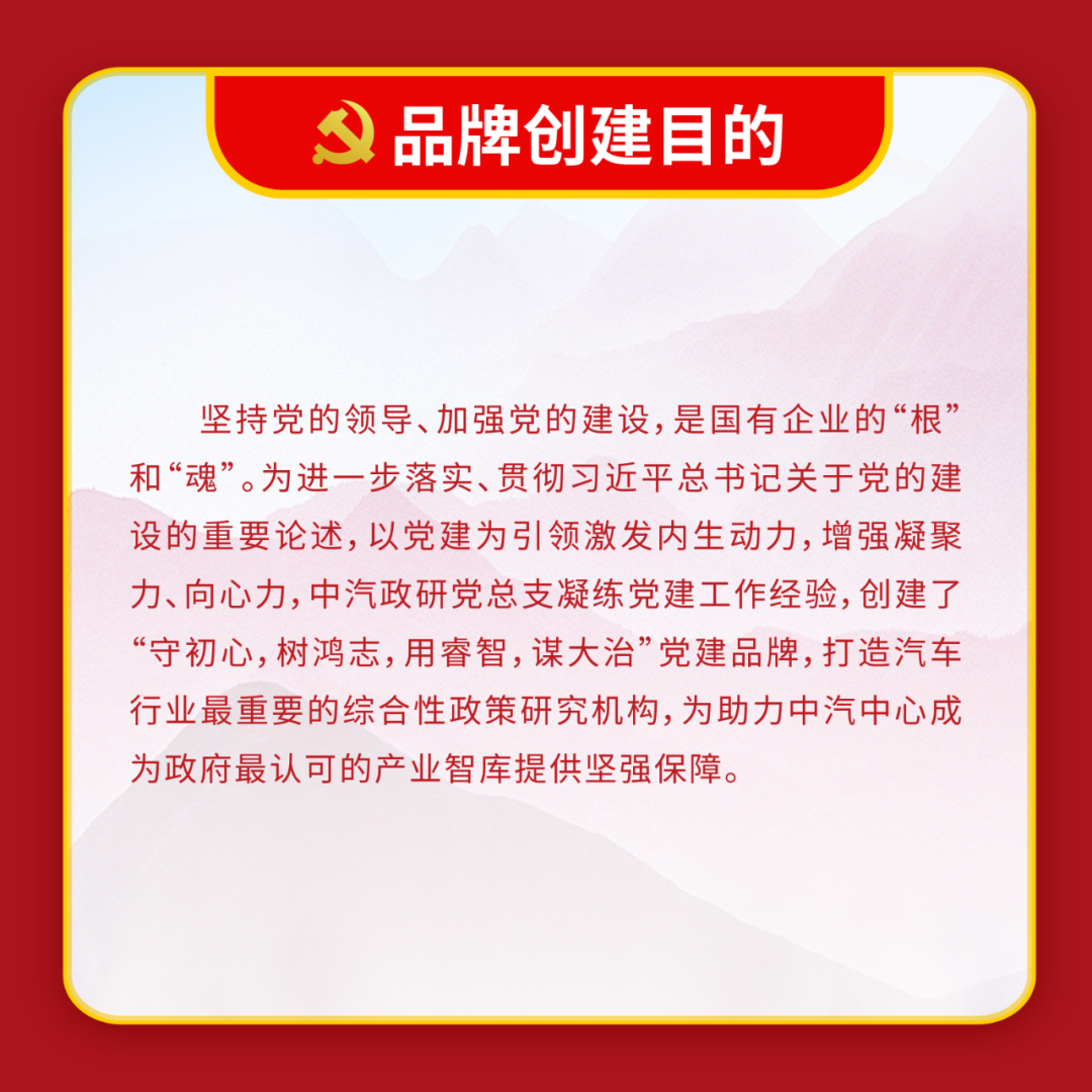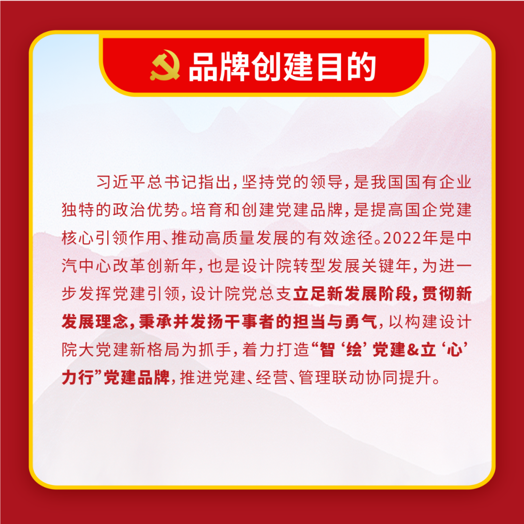 體現中汽中心立足主責主業,做強做優做大中央企業的“雄心 壯志”與強化服務支撐,成就和諧汽車社會的 “宏圖大志”, 詮釋了中汽中心以“幟〞領“志”, 以志”明“智”的黨建 工作特色。