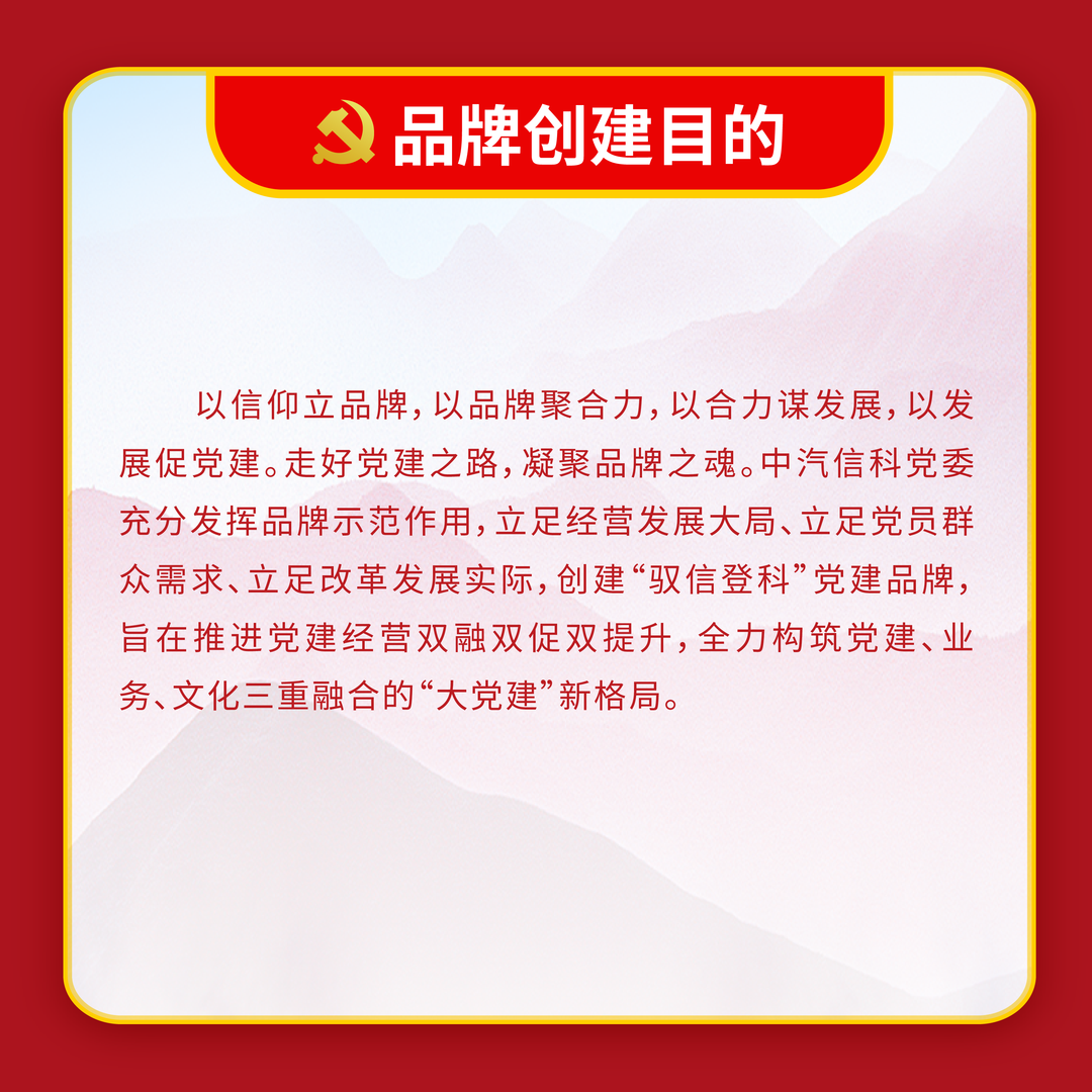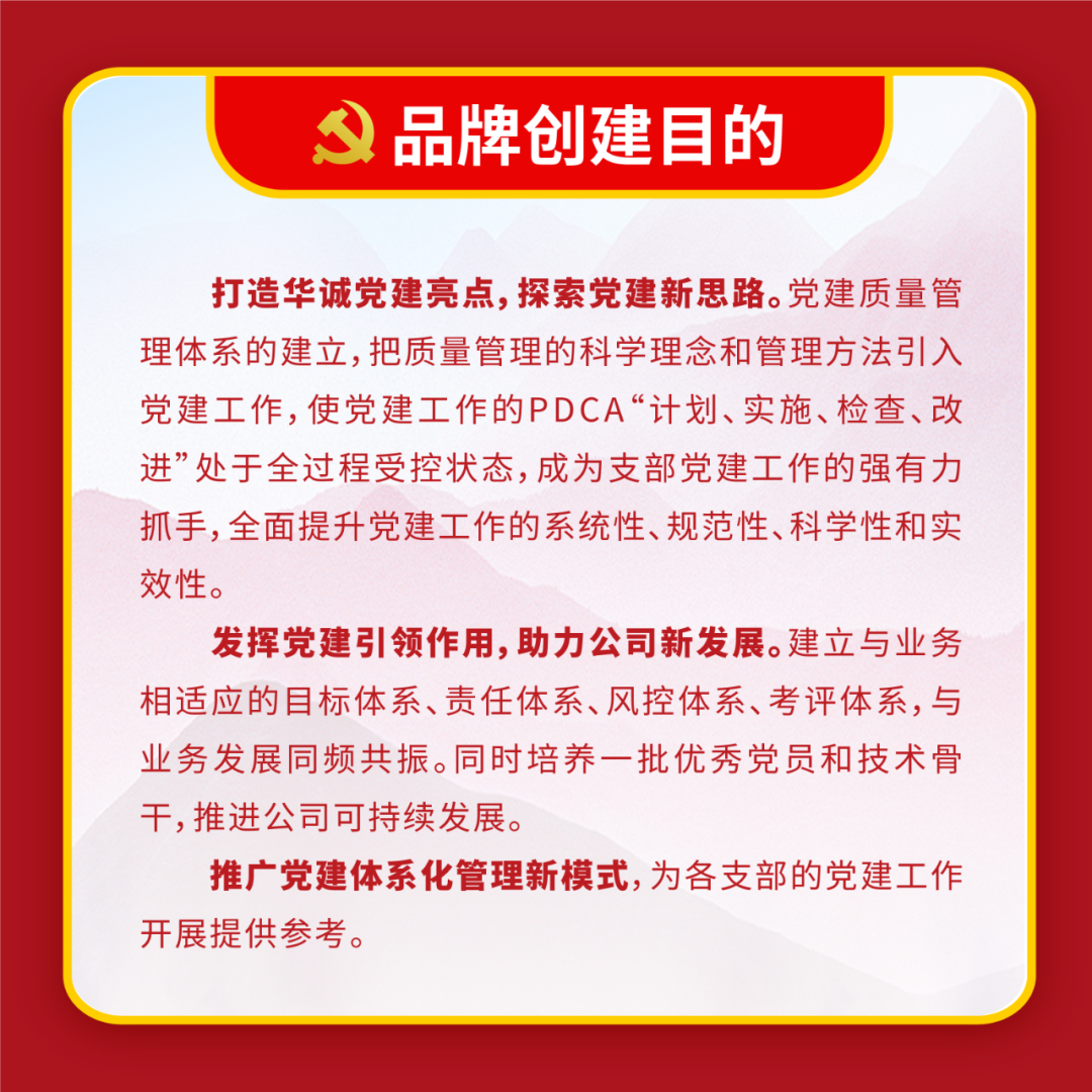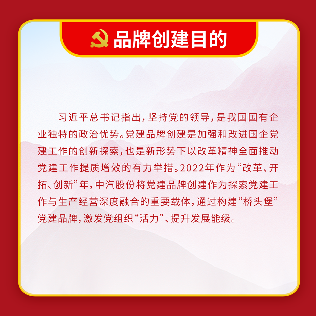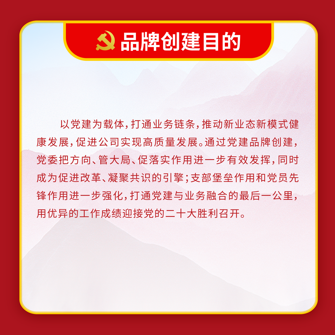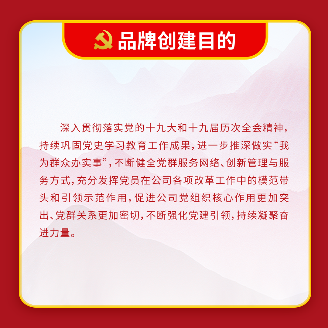 開展黨建品牌創建活動是推進黨建工作創新發展的有效途徑,也是活躍黨建工作的有效載體。為落實國資委黨委對中央企業黨建工作的有關要求,進一步加強特色品牌示范引領,形成一批有創新、有特色的黨建經驗亮點,切實用品牌建設的理念、方法和機制進一步加快推動黨建工作提質、增效、升級,全面提升基層黨建工作水平。