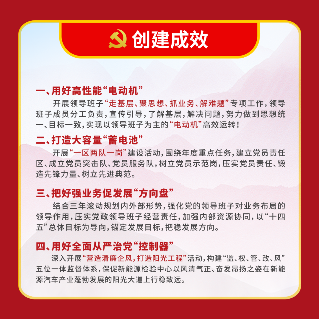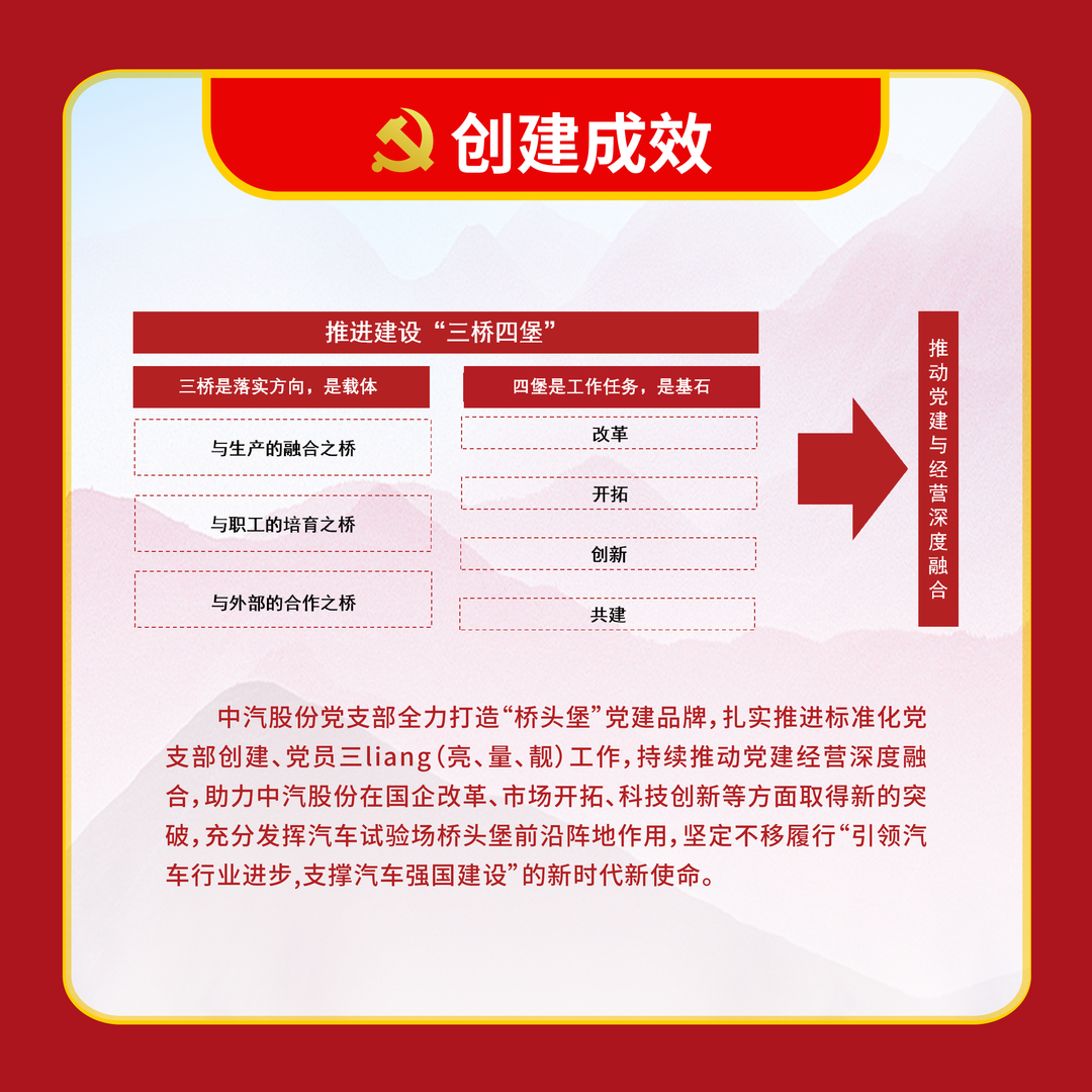 中汽中心“頂·梁·柱”黨建工作體系將黨委“把方向、管大局、促落實”的領導作用與央企“頂梁柱”的形象緊密結合,實現黨建工作從“有形”向“有效”的根本突破。